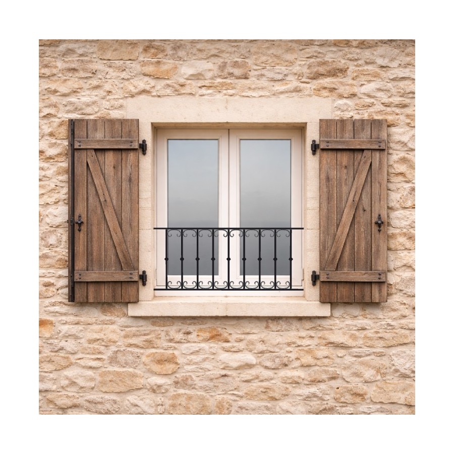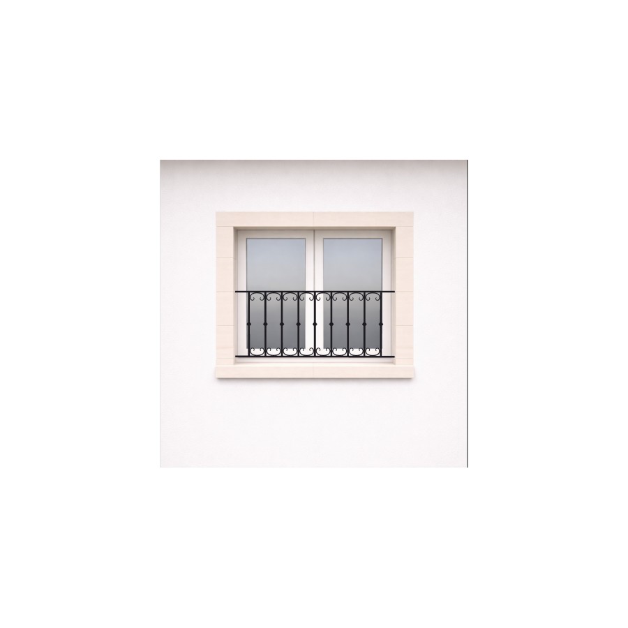Le garde-fou / garde-corps de fenêtre modèle Chataîgneraie, est composé de deux lisses en fer plat 25x12Mm, de barreaux en fer rond diamètre 14Mm avec une bague de décoration, et de volutes dimensions 110x60Mm en fer plat de 12x6Mm.