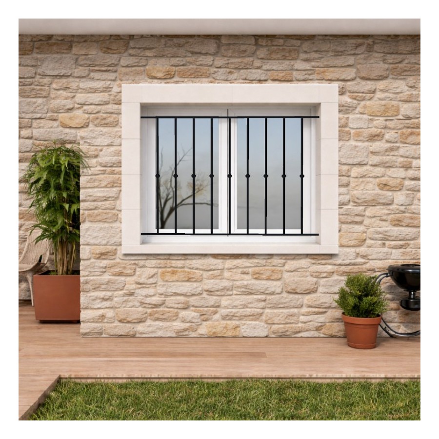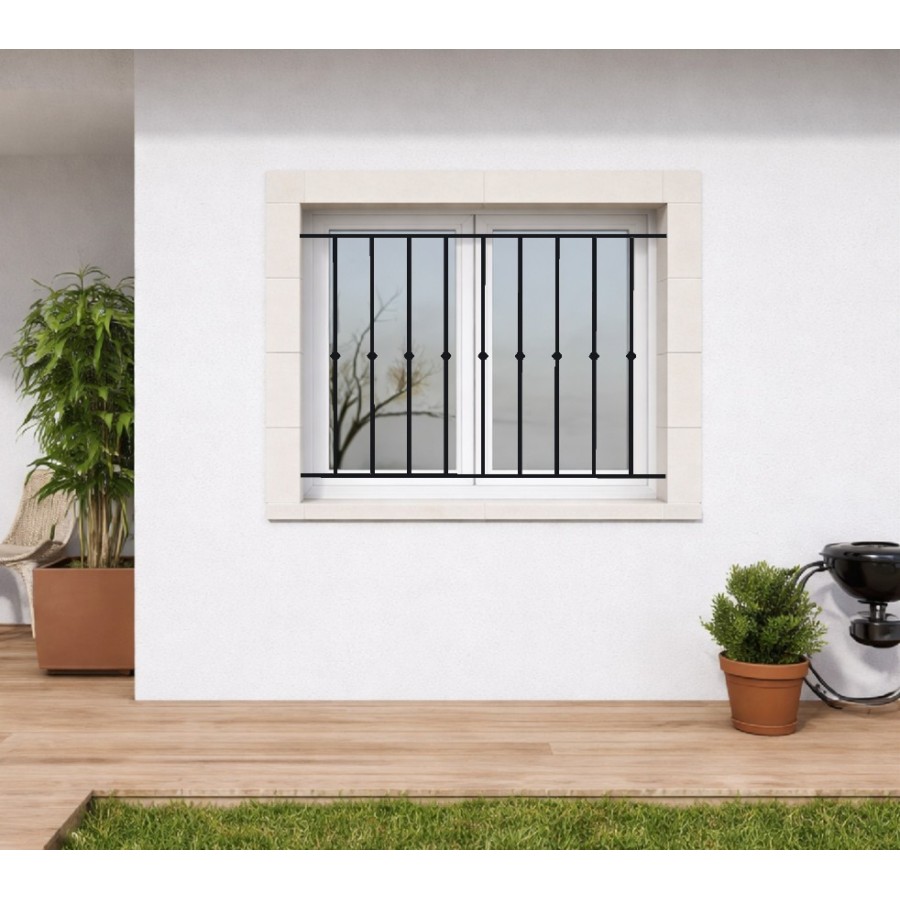 La grille de fenêtre modèle Cezais, est composée de deux lisses en fers plats 25x12Mm, et de barreaux en fers ronds diamètre 14Mm avec une bague de décoration.